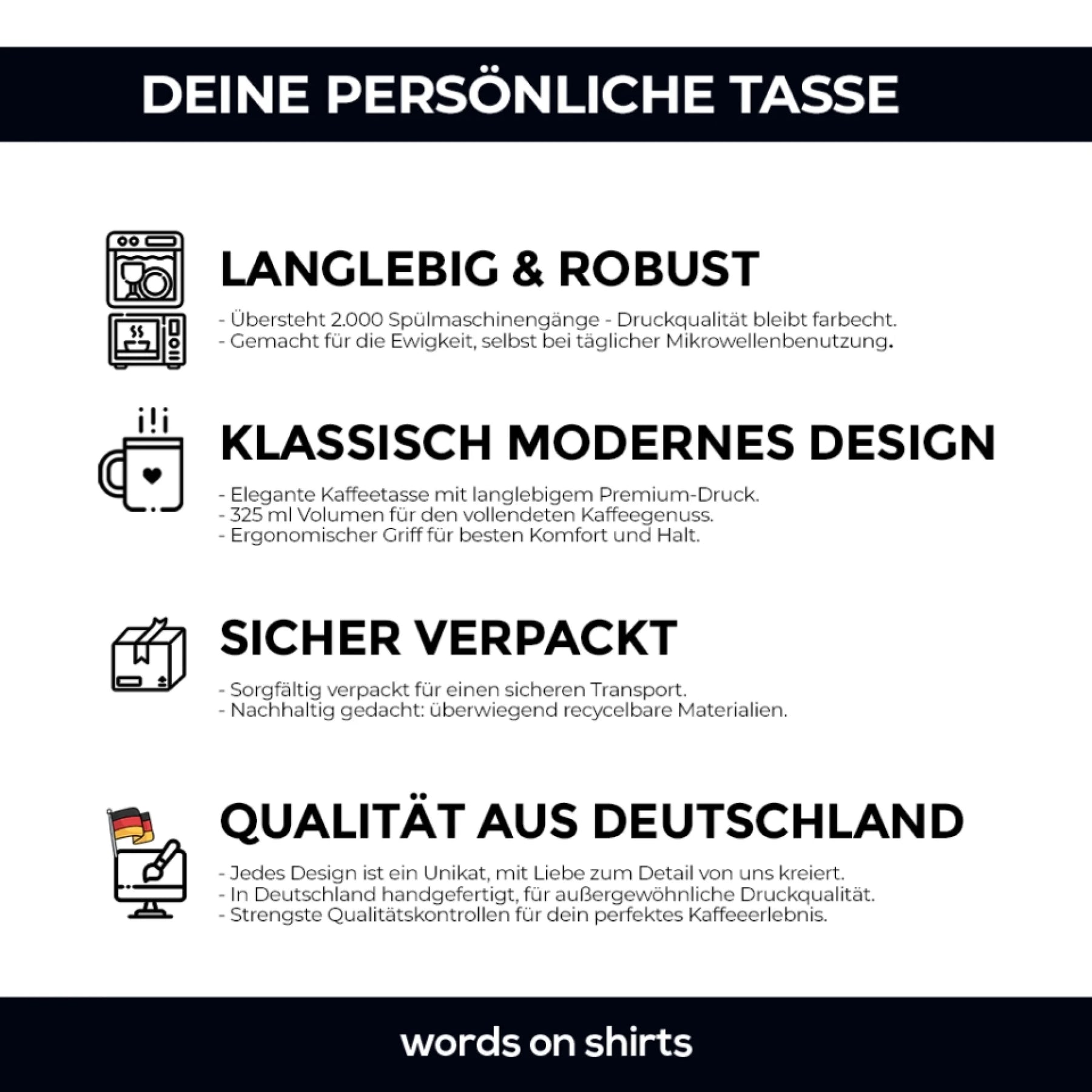 Unsere Tassen sind sowohl spülmaschinen- als auch mikrowellengeeignet, was ihre praktische Verwendbarkeit unterstreicht.